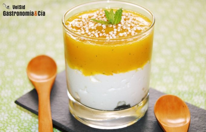 Puedes presentar el Yogur con mango y hierbabuena en vasitos, repartiendo en primer lugar el yogur colado, estará muy cremoso y denso, como un queso de untar. Sobre éste vierte la salsa de mango, será muy fluida y se combinará muy bien en cada cucharada. Termina cubriendo con un poco de quinua hinchada o unos frutos secos picados, además de unas hojas de hierbabuena pequeñas.